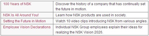 The top page of NSK's main website has also been enhanced with features such as a greater variety of images and a countdown clock for the 100th anniversary. We urge you to experience for yourself how NSK is “Setting the Future in Motion.”