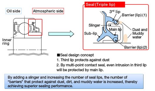 By adding a slinger which was not used in the previous product, is increasing the number of seal lips, the number of “barriers” that guard against dust and muddy water is increased, thereby achieving superior sealing performance.