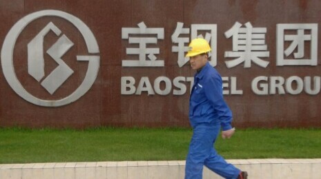 A labourer walks past the gate of the headquarters of Baosteel Group Corp. in Shanghai, April 1, 2010.
