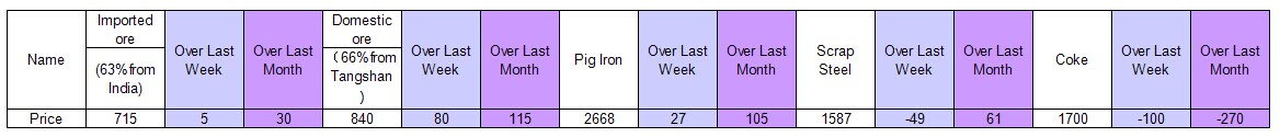 Remark: the data of imported ore come from 63% of Indian ore in Tianjin ports; the data of domestic ore from 66% of Hebei iron power; the data of pig iron from the average price excluding tax of scarp steel of 6-8mm thick; the data of coke from the ex-factory price (including tax) of the secondary metallurgical coke of Tangshan.