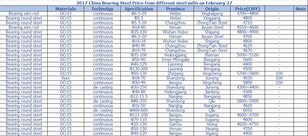 2017 China Bearing Steel Price from different steel mills on February 27
