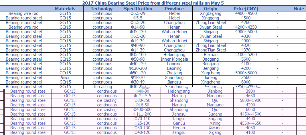 2017 China Bearing Steel Price from different steel mills on May 5