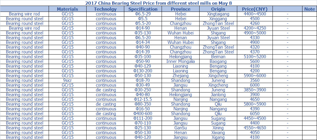 2017 China Bearing Steel Price from different steel mills on May 8