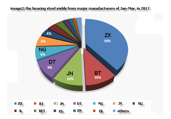 As we can see from image 2,the yields from ZHONGXING Bearing Steel(XINYE and XINCHENG), JUNENG and BENTE are the three companies ahead of others, and these three contributes 59% of the yields.The total yields of bearing steel was still growing, especially for ZHONGXING Bearing Steel, ZHONGTE and South Bearing Steel year-on-year growth.