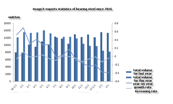 From January to March, the export quantity of bearing steel was 26,486 tons, down 12,728 tons than the same period of last year. The volume decreased by 32.46% year on year. On March, the export quantity of bearing steel was 8225tons, down 262tons than last month.The volume decreased by 38.69% year-on-year and also decreased by 3.09% comparing the last year.