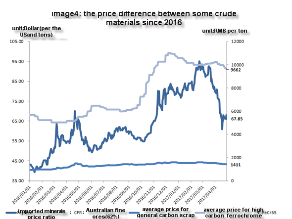 In April, the imported price of minerals fell sharply to 67.85dollars/ton. While the market price general carbon and steel scrap dropped to 1411RMB/ton, which was decreased by 6.37% comparing with last month. There was weak operation to the price of high carbon ferrochrome, the average price was 9662RMB/ton at the end of this month. On the whole, the inventory pressure is expected to ease with the improvement of supply and demand . So in May ,the materials of the bearing steel will also take shock operation .