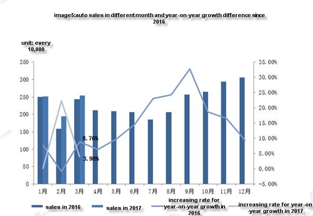 Statistics from China Automobile Industry Association: March, 2017, the overall sales volume was showed a rapid growth , but it’s slightly decreasing year-on-year growth.