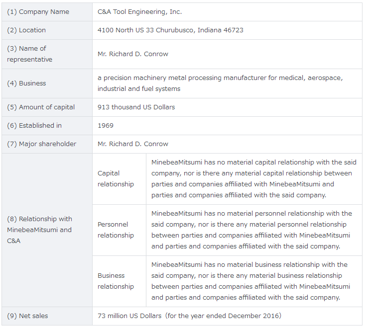 MINEBEA MITSUMI Inc. ("MinebeaMitsumi") hereby announces that MinebeaMitsumi, in coordination with the Development Bank of Japan ("DBJ"), has agreed with the shareholders of C&A Tool Engineering, Inc., a precision machinery metal processing manufacturer (Headquarters located in Churubusco, Indiana, "C&A"), with its products used for medical, aerospace, industrial and fuel systems to acquire all shares of C&A.