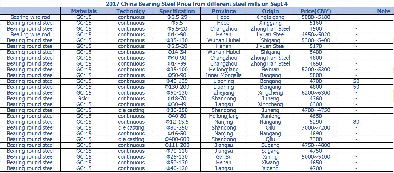 2017 China Bearing Steel Price from different steel mills on Sept 4