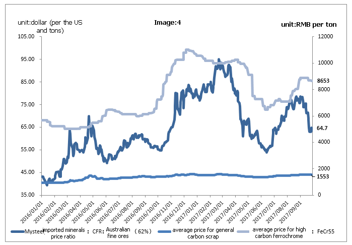 In September, the price of imported minerals fell to 64.7dollars/ton. While the market price of general carbon and rust steel remained higher to 1553RMB/ton, which was increased by 4.72% comparing with last month. The price of high carbon ferrochrome pulled back and the average price was 8653RMB/ton at the end of this month. With the influence of Safety and environment policy, The raw material price was estimated weakly volatile