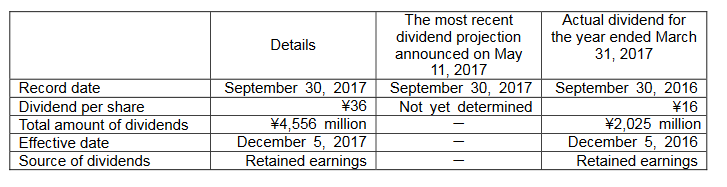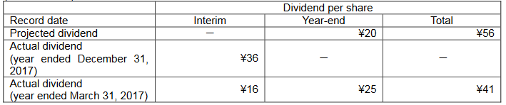 Our dividend policy places importance on stable and continuous distribution based on midterm operating results that reflects the changes in external operating environment. In accordance with this policy, we have decided to pay an interim dividend of ¥36, considering the forecasts for the year ending December 31, 2017.The projected amount of the year-end dividend is ¥20 per share. The actual dividends for the second quarter ended September 30, 2016 and year ended March 31, 2017 were ¥16 and ¥25, respectively.