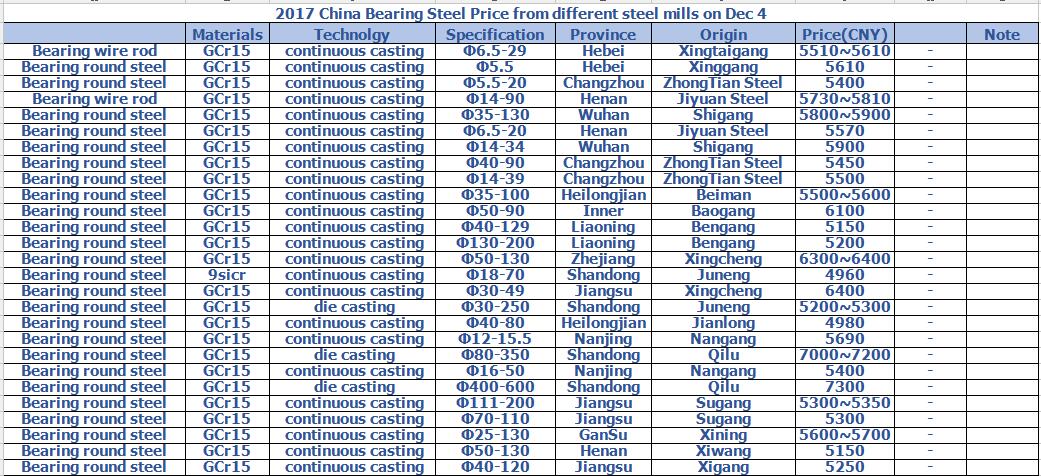 2017 China Bearing Steel Price from different steel mills on Dec 4