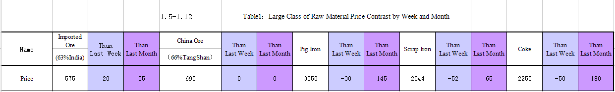 Remark: the data of imported ore come from 63% of Indian ore in Tianjin ports; the data of domestic ore is from 66% of Hebei iron power; the data of pig iron is from the average price including tax of pig iron for steel making ;The data of scrap steel is from the average price including tax of of scrap steel of 6-8mm thick; the data of coke from the ex-factory price (including tax) of the secondary metallurgical coke of Tangshan.