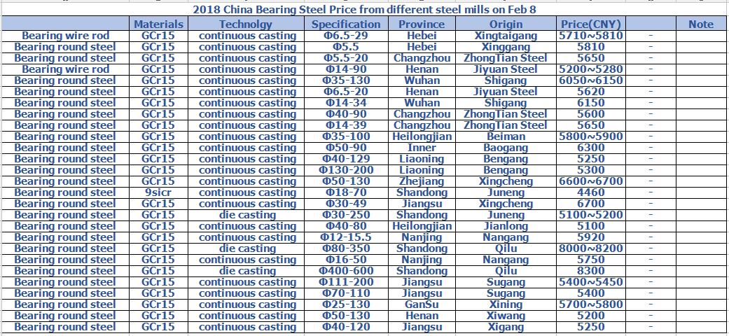 2018 China Bearing Steel Price from different steel mills on Feb 8