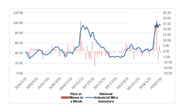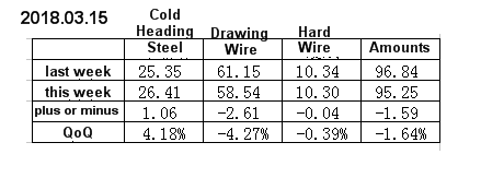 On March 15th, 2018, statistics were collected on 14 major cities, 78 traders, and 21 warehouses in the country. The total amount of industrial wire rods was 952,500 tons, which was a decrease of 15,900 tons, a decrease of 1.64% over the same week last week. Among them: 26.41 million tons of cold heading, an increase of 1.06 million tons, an increase of 4.18% over the same week last week; drawing 558,400 tons, a decrease of 2.61 million tons, a decrease of 4.27% compared to last week; hard line of 10.3 million tons, Last week, the same statistics reduced by 0.04 million tons, a decrease of 0.39%.