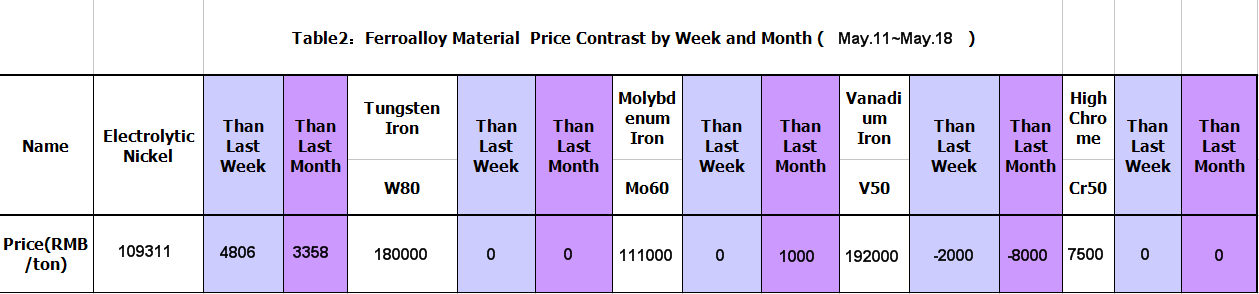 This week, among the five categories of raw materials, the prices of scrap steel decreased, imported ore, pig iron,domestic ore and coke increased. The main tungsten iron, ferromolybdenum and high chromiumand remained flat, ferrovanadium,silica,high-manganese and electrolytic nickel decreased.