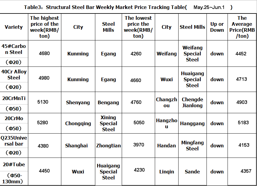 1.Price Tracking of Structural Steel Bar in a Week(unit: RMB yuan/ ton)