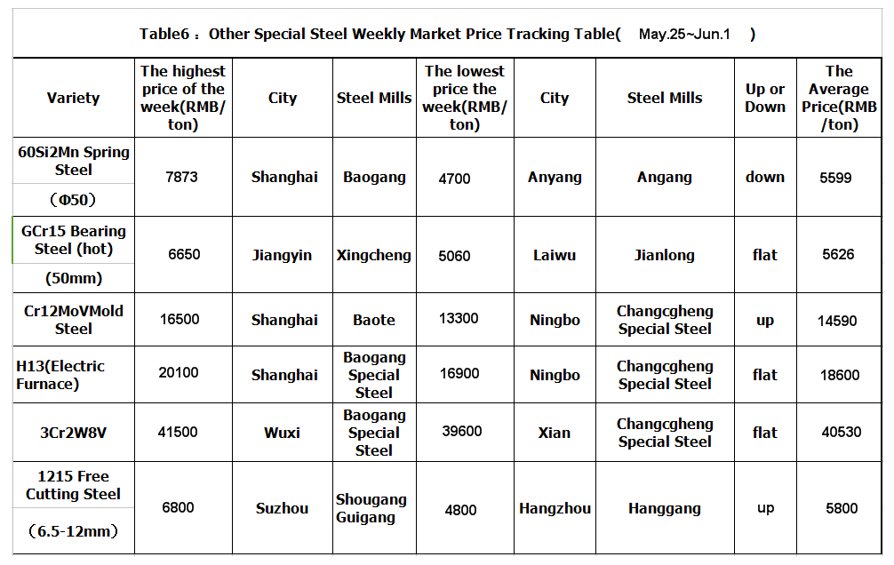 1. Up to 1st Jun ,the price index of special steel reached to 125.76, 0.48% up over last week and up 1.48% over last month.