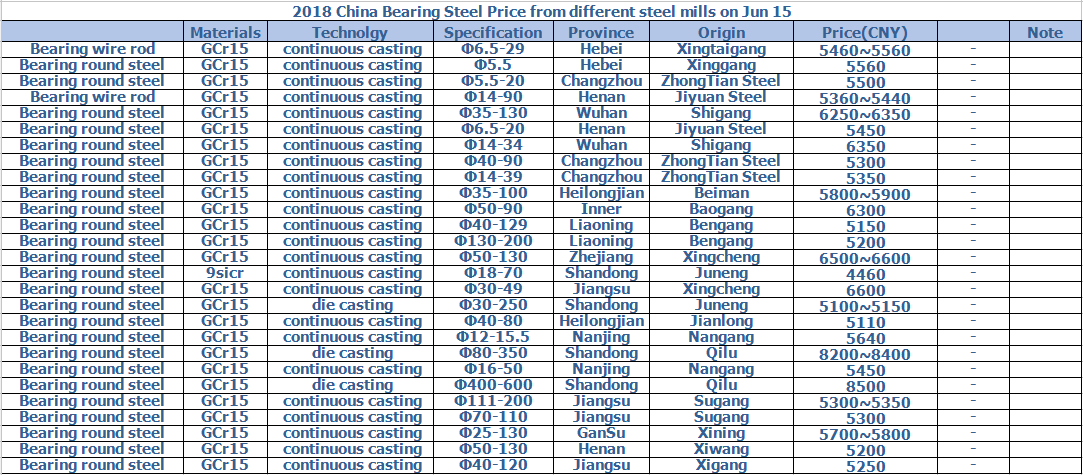 2018 China Bearing Steel Price from different steel mills on Jun 15