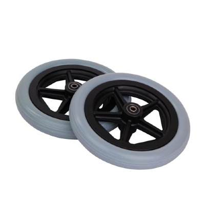 The front and rear wheels of wheelchairs can be pneumatic type with hollow tires and inflatable chambers, which provide a higher level of cushioning and comfort, or with more wear-resistant cast tires.