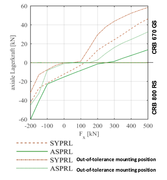 The ASRB significantly increases the axial load carrying capacity while achieving a more balanced internal load distribution between both roller rows. The improved load distribution between the roller rows provides increased resistance against plastic deformation and significantly extends the bearing service life.