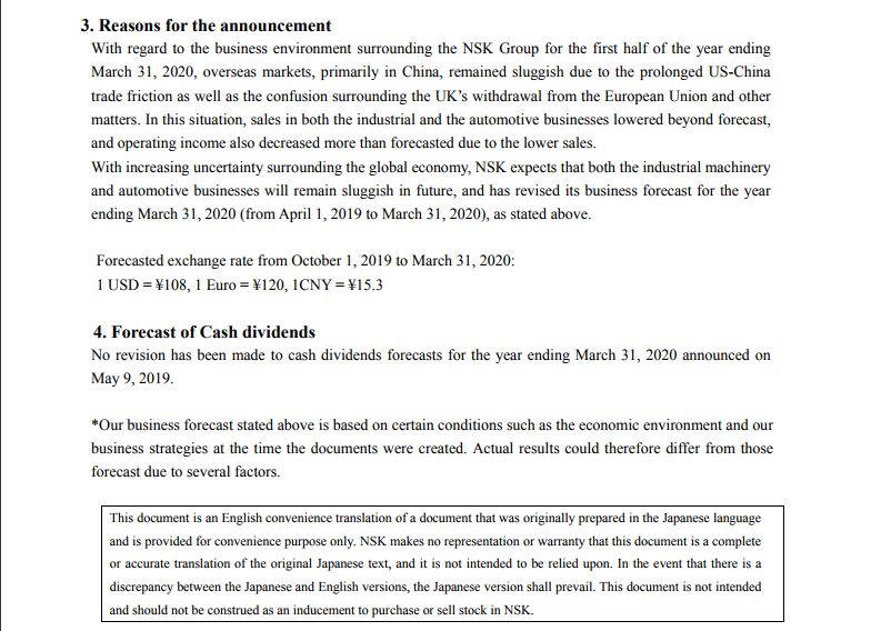 NSK Announces Differences between Forecasted and Actual Consolidated Business Results for First-half for the Fiscal Year Ending March 31, 2020 and Revision of Year-end Consolidated Business Forecast