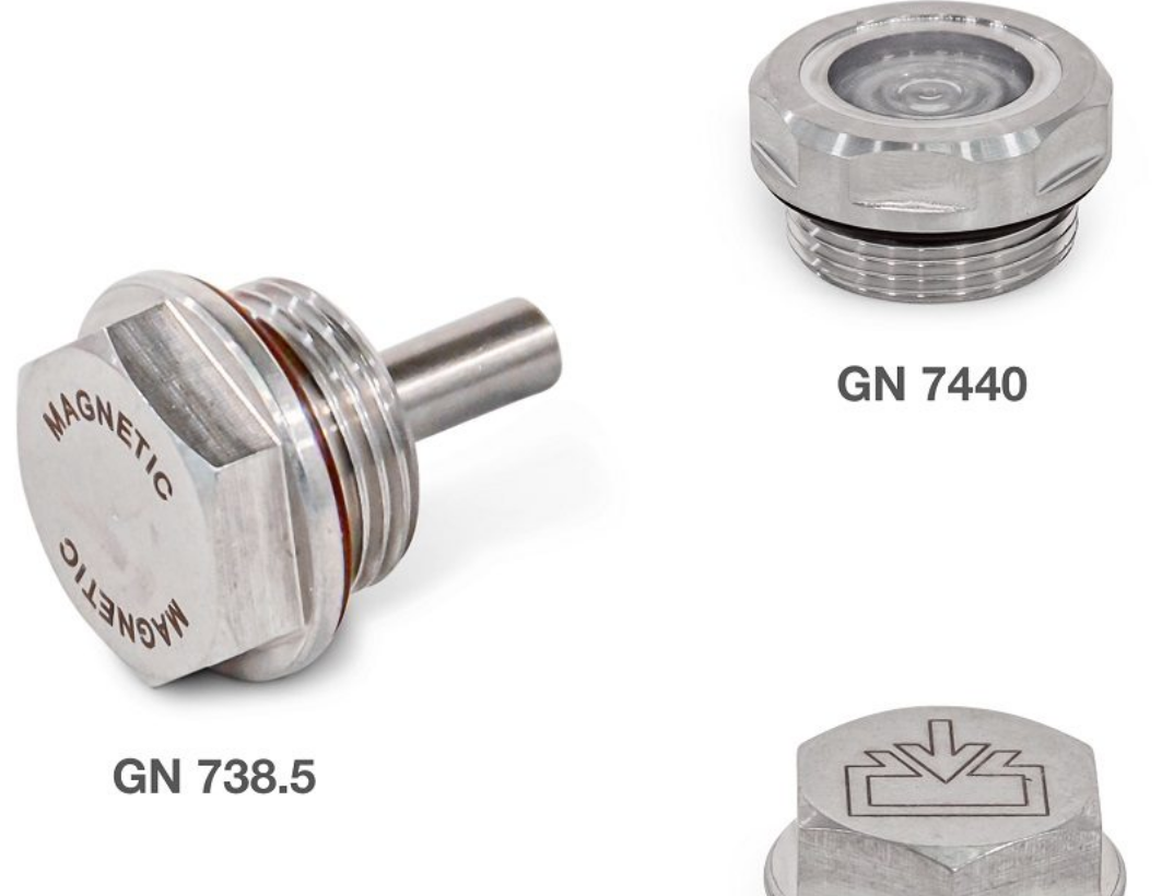 The magnetic plugs GN 738.5 look quite similar, except they have an integrated bar magnet that extends into the fluid to reliably capture any iron particles that could damage gears or the like.
