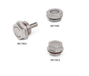 The magnetic plugs GN 738.5 look similar, except they have an integrated bar magnet extending into the fluid to reliably capture any iron particles damaging gears.