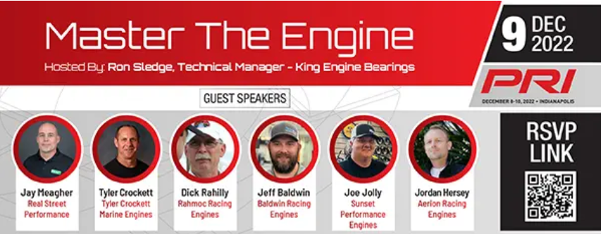 King Engine Bearings will be hosting an engine builder roundtable at the 2022 Performance Racing Industry (PRI) trade show in Indianapolis. “Master the Engine” seminar will be hosted by King’s Technical Manager, Ron Sledge, with six engine builders in a Q&A format, uncovering the latest engine building trends, best practices, and insider tips and tricks. The panel consists of Jay Meagher, Tyler Crockett, Dick Rahilly, Jeff Baldwin, Joe Jolly, and Jordan Hersey, who are specialists in applications such as NASCAR, marine, sport compact, Pro Mod, and Circle Track.