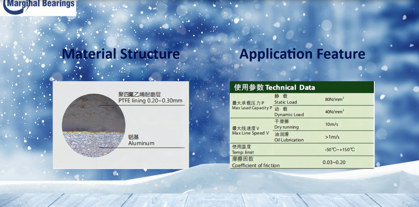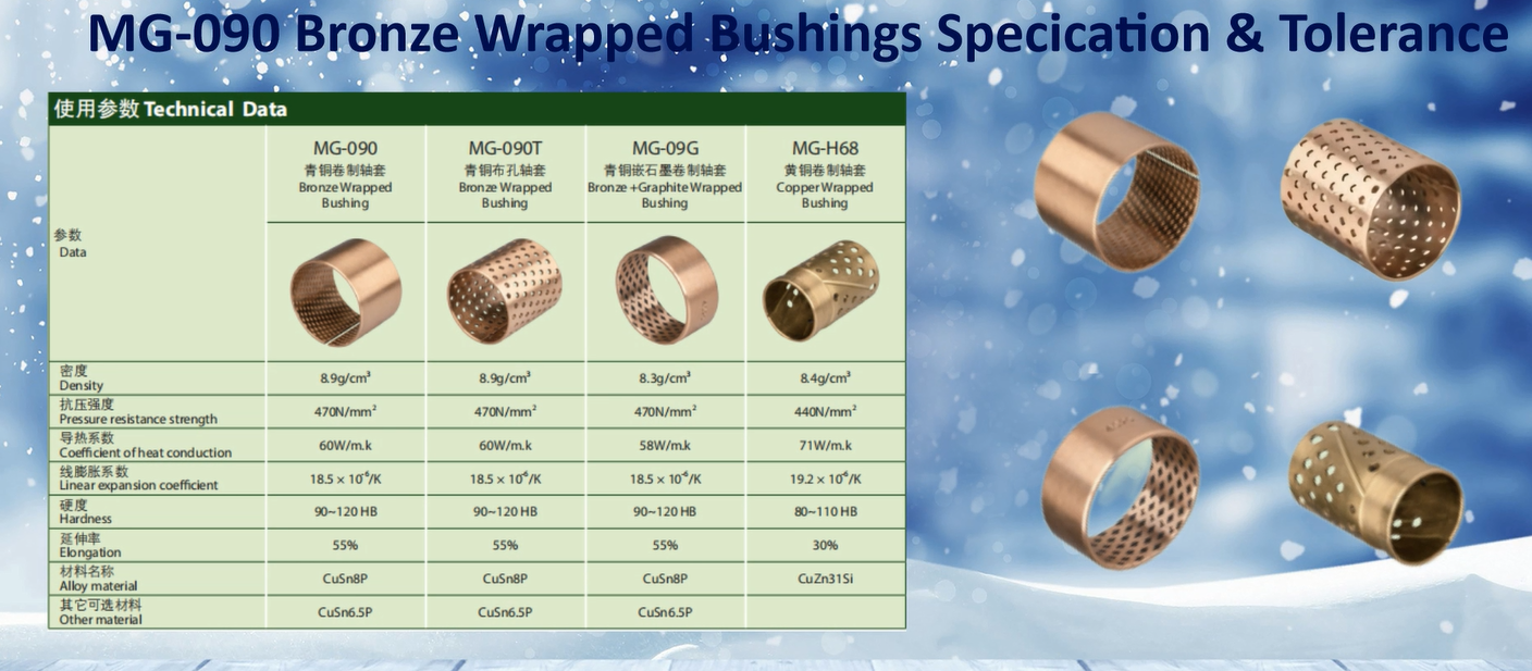 Today, we will recommend five main products from Marginal Bearing, including Metal-Polymer Composite Bearings,MG-TEX Steel with PTFE Fiber Fabric Bearings,MG-1A Aluminum matrix composite bearing,MG-800 Bimetallic Self-lubricating Bushes and MG-090 Bronze Wrapped Bushings.
