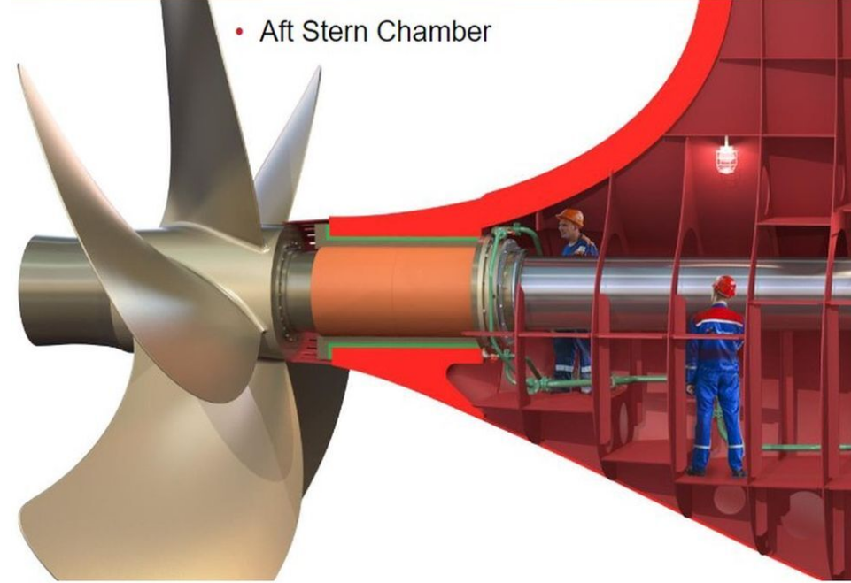 A shortened shaftline, a short aft stern chamber, no forward sterntube bearing or cylinder casing, and an aft water-lubricated after sterntube bearing are features of the design. A temporary means of access to the stern chamber is offered for inspection and maintenance, which could be achieved without the ship needing drydocking.