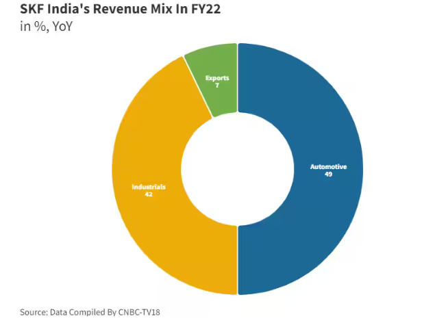SKF India caters to two-wheelers and CVs within the automotive segment, aerospace, marine, oil and gas, railways, wind energy within industrials, and also caters to F&B, pulp and paper, agriculture and wind energy segments. This is done via six manufacturing facilities and over 450 distributors.