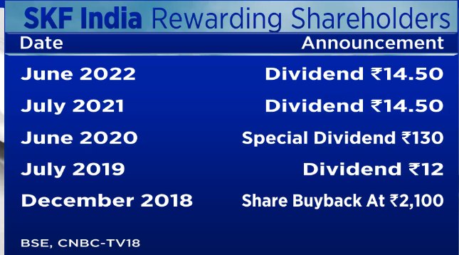 SKF India is a debt-free company and has regularly been paying dividends. Over the last five financial years, dividend payout has been to the tune of 18-20 percent. In the financial year 2020 the company paid 220 percent of dividends.