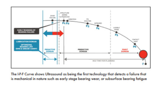 Airborne & structure-borne ultrasound has become a major player in bearing condition monitoring. Once considered just a leak detector, more maintenance & reliability professionals are beginning to realise all of the benefits associated with using ultrasound for condition monitoring applications. The P-F Curve with which we have all become familiar with reflects that trend.