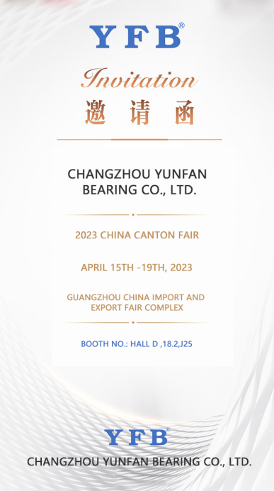 On April 15th -19th, 2023, we YFB will attend the 133rd China Canton Fair in Guangzhou China Import and Export Fair Complex. We sincerely invite you to visit our booth Hall D ,18.2,J25 for communication and cooperation. At that time, we will solemnly show you our main products: roller bearings, solid ferrule needle roller bearings, combined bearings, etc. A warm welcome for your visit. YFB will be your best partner.