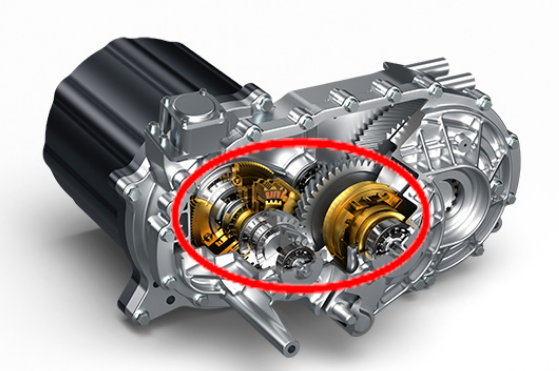 Increased torque at low speed with two-speed gear shift that enables the same motor to not only be used in passenger cars but also commercial vehicles and pickup trucks