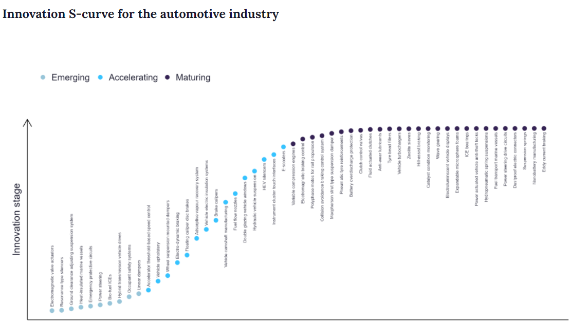 However, not all innovations are equal and nor do they follow a constant upward trend. Instead, their evolution takes the form of an S-shaped curve that reflects their typical lifecycle from early emergence to accelerating adoption, before finally stabilising and reaching maturity.