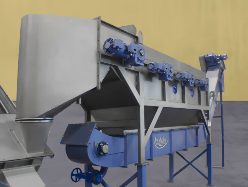 Herbold Density Separation Tanks or Sink-Swim Tanks use water to separate plastics of different densities in post-consumer recycling systems. Can be used to separate contaminants from homogenous plastics. Items are introduced to the large steel tanks by a feeding screw or conveyor at one end.