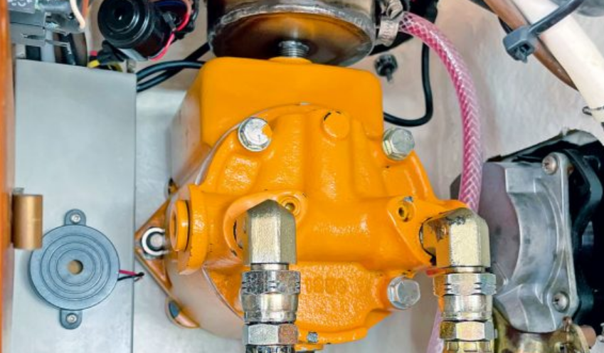 After finding a hydraulic oil leak in the steering of his Nauticat 331, Mike Corp services the yacht’s helm pump and steering ram