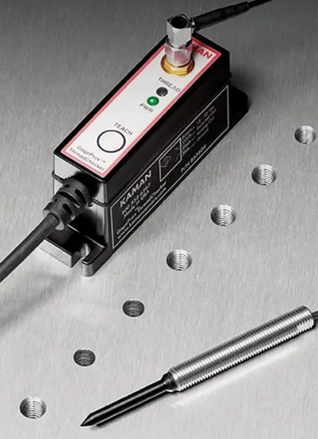 The Measuring Division of Kaman Precision Products, Inc., a world leader in the design and manufacture of high-performance, precision non-contact position measuring systems, announces the availability of its improved ThreadChecker. This line of non-contact application-specific sensors provides rugged, reliable verification of thread presence or absence in nearly any electrically conductive material. The ThreadChecker is a teachable eddy current inspection tool, widely used for thread detection, material sorting, plating presence, and absence of heat treatment, as examples. Any physical property difference that relates to material conductivity is readily detected. These sensors are available from stock and ready to ship immediately.