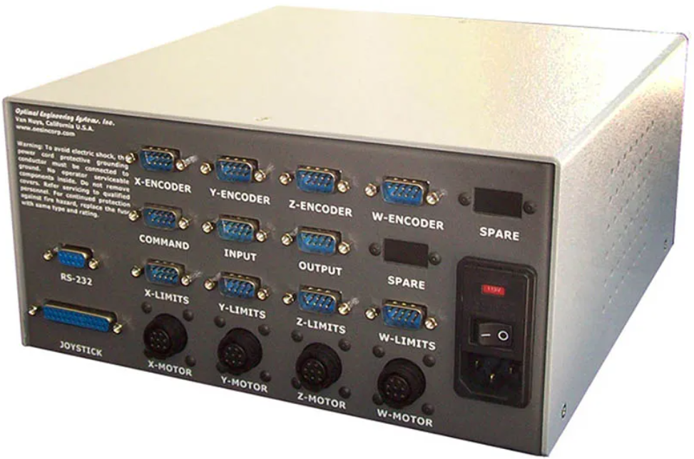 Complementing the OES (Optimal Engineering Systems Inc.) growing line of single and multi-axis positioning stages is the Allegra Series of Stored Program Motion Control Systems Controllers. The Allegra Series of Controllers is available as a desktop (pictured) or 19" rack mount system. These easy-to-use, plug-and-play motion controllers can be configured for 1, 2, 3, or 4 axes of motion. With the appropriate drivers selected, any combination of Stepper Motors, DC Brush-type Servo Motors with Quadrature incremental encoders, three-phase Brushless DC Servo Motors with Quadrature incremental encoders or Hall effect sensors, or Voice Coil Motors with linear encoders can be controlled.
