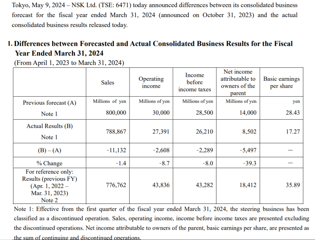 NSK Announces Differences between Forecasted and Actual Consolidated Business Results for the Fiscal Year Ended March 31, 2024