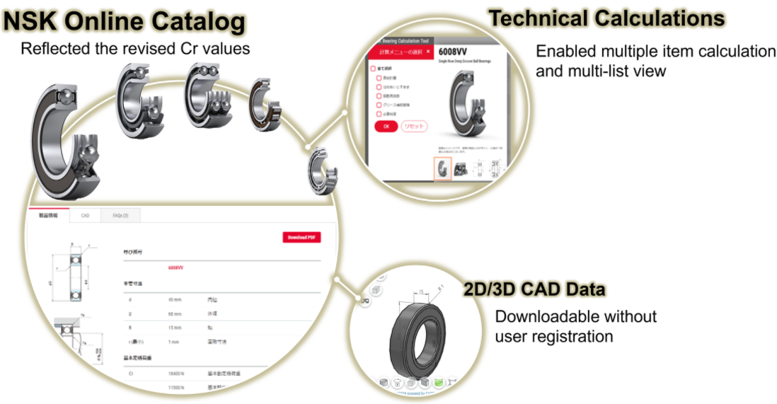 ●Three engineering tools updated on the NSK website (NSK Online Catalog, Technical Calculations, and 2D/3D CAD Data)