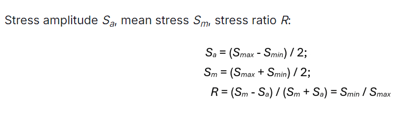 For shaft verification normally different shaft sections are selected, where a detailed analysis is made. In a section of a shaft, in general, there are different acting stress types: axial stress (tension or compression) Szd, bending stress Sb, torsional stress Tt, and shear stress Ts. Their maximum and minimum values (Smax, Smin or Tmax, Tmin) must be used. With a load spectrum, for every bin of the spectrum, in a determined section of the shaft the maximum loads must be calculated (axial force Fzd,max, bending moment Mb,max, torsional moment Mt,max, and shear force Q,max). Then the corresponding maximum stresses (axial Szd,max, bending Sb,max, torsion Tt,max, shear Ts,max) are found, using well-known equations (as in AGMA 6001, chapter 4.4, Ref. 13 or in Ref. 5, formula 1.1.1). The minimum stresses can be derived with the ratio factors:
