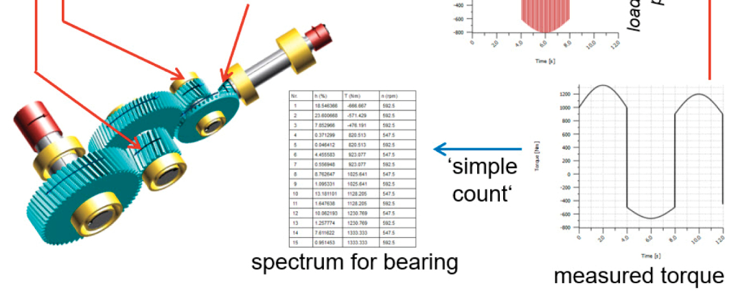 If time series have positive and negative torques/speeds, then alternating load changes arise, which are very sensitive for strength verifications. For gears load spectrums of type C, for shafts type B, and for bearings type A must be used—meaning for a shaft, a gear, or a bearing calculation, a different load spectrum must be used. To make things even more complicated, the load spectrum for every gear pair must be produced separately. This will be explained in the next section. The handling of time series with positive and negative torques/speeds in systems is very complex and requires special adaptations in drive-system software. If, for example, the time series is given for the input coupling of the system, then for every gear pair, the ratio r between the input coupling and the pinion of the pair must be known. Then the time series (given for the input coupling) is adapted to the pinion by multiplying the torque by r and reducing the speed by r. This modified time series is then used to generate the load spectrum for the verification of the gears. The same procedure can be repeated for shafts and bearings.