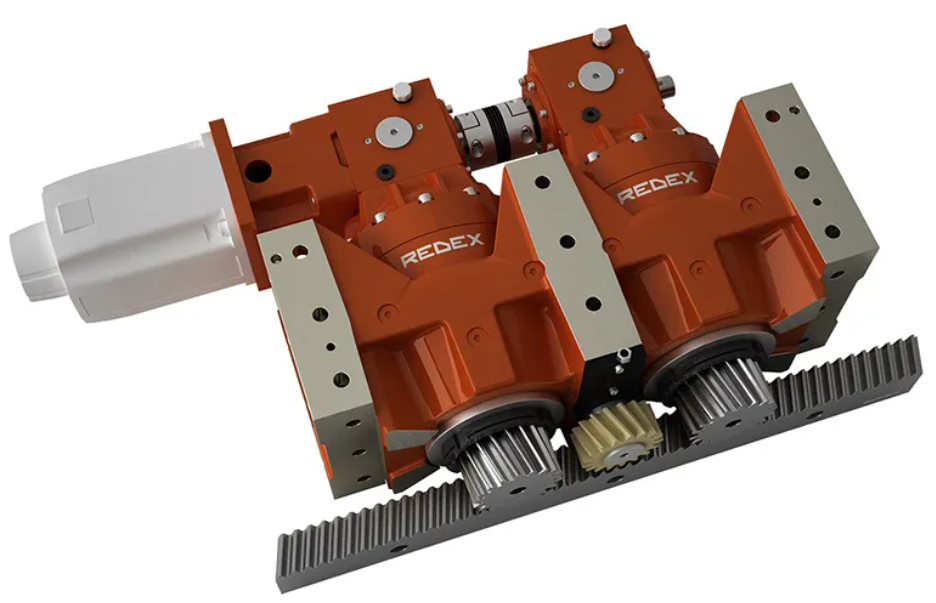 The Redex machine tool lineup features preloaded rack & pinion solutions for linear axis drives, ring gear and pinion for rotary axis drives, and 2-speed spindle drive gearboxes providing constant power to the spindle. Redex rack & pinion dedicated reducers are uniquely designed to provide high stiffness and work with DualDRIVE mechanical and TwinDRIVE electrical preloading technologies to eliminate backlash and ensure precise positioning over the entire axis length. Redex’ latest SRP+ and KRP+ Rack & Pinion Dedicated Reducers - These enhanced gearing solutions feature minimal transmission error for smooth operation and low noise while providing an excellent surface finish when driving machine tool axes. Thanks to continuous enhancements, SRP+ and KRP+ rack & pinion dedicated reducers offer seven to 40 percent greater torque capacity compared to previous versions. Dual KRP Rack & Pinion Drive - This closed-loop system combines two KRP reducers and a DualDRIVE mechanical preload to eliminate backlash. Only one motor is required to drive the axis. MSR High-Torque VTC Table Drive - Combining two identical right angle two-speed gearboxes that equally share the driving torque during turning, this turntable drive delivers precise, C-axis motion without backlash for milling and drilling operations.