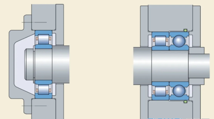 In the figure, the bearing combination on the right includes a cylindrical roller bearing and a ball bearing, which jointly assume the function of the locating end; on the left, only one cylindrical roller bearing is installed, which is used as the non-locating end. All radial loads of the entire shaft system are mainly borne by the two cylindrical roller bearings, while the axial positioning depends on the ball bearing. In order to prevent the ball bearing from being subjected to unnecessary radial loads, the radial support of the ball bearing is usually loosened during design and fixed by clamping devices on both sides. In addition, in order to prevent the outer ring of the ball bearing from moving in the bearing seat, an O-ring is usually added inside the bearing seat.