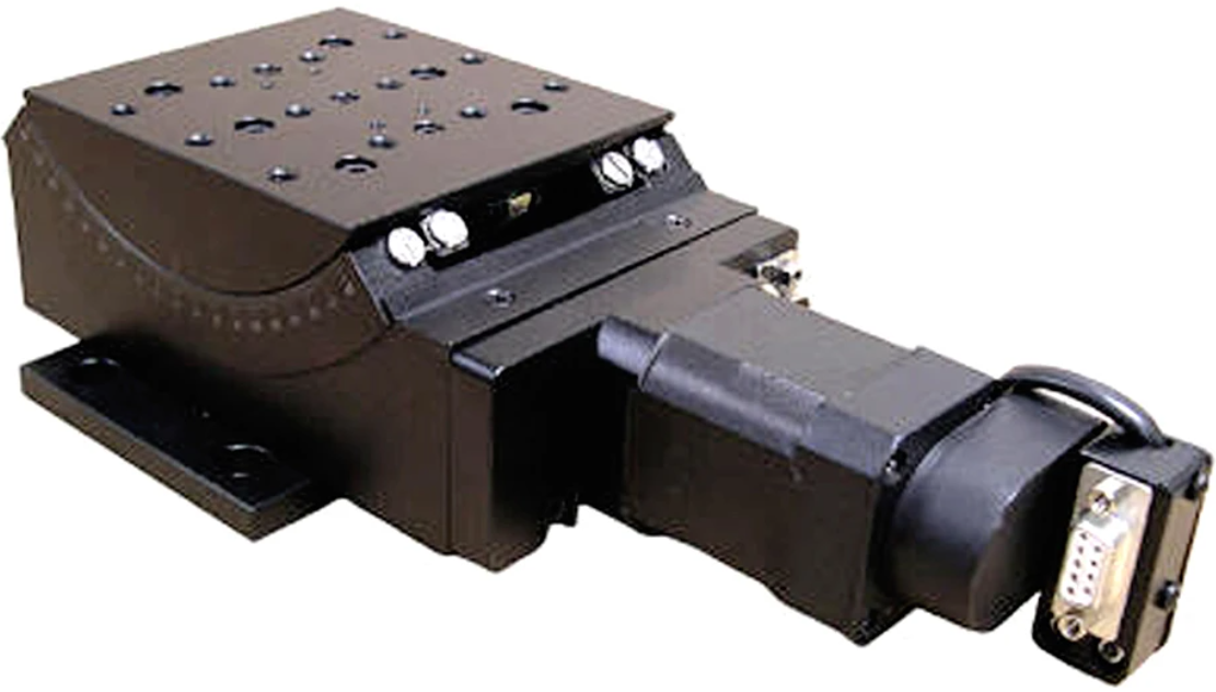 Optimal Engineering Systems, Inc. (OES) has added four high-resolution, low-profile goniometers to their expanding catalog of high precision positioning stages. This newly released, AK120-45 Goniometer Series features precision ground worm gears with a 296:1 ratio and pre-loaded cross roller guides, and +/- 45 degrees of travel with 10kg of load. The very high resolution of 0.0006 degrees (2.16 Arcsec.) is realized when using the standard Two-Phase Stepper Motor driven by a 10 micro-steps per step micro-stepping driver or with the Servo Motor options and Quadrature Optical Encoders. The AK120-45 Series of goniometer stages feature four motor options. The -01 option is Stepper Motor driven. The -02 option (pictured) is driven by a Three-Phase Brushless Servo Motor with a Quadrature Optical Encoder, the -03 version is DC Brushed Servo Motor Driven with a Quadrature Optical Encoder, and the -04 option is Stepper Motor Driven with the knob replaced with a Quadrature Optical Encoder for position verification. The highest resolutions, accuracy, and travel speeds are achieved with the servo motor options -02 and -03. This AK120-45 Goniometer Series of Stages has a large 104mm long by 90mm wide table with a precision pattern of mounting holes for precise location of fixtures. The height of rotation is 40.5mm above the surface of the table and the radius of rotation is 67mm making them ideal for: Microscopy, crystallography, measurement of surgical cutting blades, laser positioning, light measurement, and inspection applications. The 10kg load capacity of these stages allows for stacking of a second goniometer stage or it can be used as a building block in a multi-axes stage including linear and rotary axis-stages. A calibrated indicator displays the angle of rotation. The stage can be ordered with a fully plug-and-play compatible motion controller from OES.