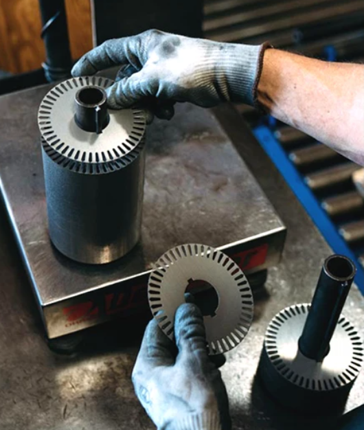 Arnold Magnetic Technologies Corporation, a subsidiary of Compass Diversified and leading global manufacturer of high-performance magnets, electric motors and precision thin metals, empowers manufacturers to build smaller, lighter, and more efficient motors and generators with Arnon Non Grain Oriented Electrical Steel (NGOES). With optimized thickness and finish, Arnon NGOES creates considerable energy savings by reducing eddy currents. This optimization enables manufacturers to meet the most demanding needs of high speed, high efficiency motor and high efficiency transformer applications. To laminate these structures, many manufacturers use NGOES due to the electrical steel’s circularity and equal magnetic properties in all directions. Depending on the design, either the rotor or stator will incorporate laminated structures. But not all NGOES are created equal. Manufacturers frequently use Arnon NGOES as laminations in high speed, high efficiency motors and generators due to the material’s optimized thickness. Arnold manufactures NGOES in thicknesses of 0.004″, 0.005″ and 0.007″ (0.102mm, 0.127mm and 0.178mm). This marks a significant reduction from the typical thickness of NGOES laminations, which often come in 0.0118″ to 0.0185″ (0.30mm to 0.47mm) thicknesses. Thinner laminations help high speed motors and generators achieve higher levels of performance through improved efficiency. Arnon NGOES proves particularly advantageous in higher frequency motors and generators above 400HZ. The thinner material offsets effects created by increased eddy currents and subsequent heat buildup. Thin laminations built with Arnon thus produce a more efficient unit and free up design constraints. Arnon laminations also lead the industry for switching frequencies above 1K Hz. Several motors manufactured with Arnon have exceeded 98% efficiency so Arnon can lower core loss by up to 50% when compared to other NGOES.