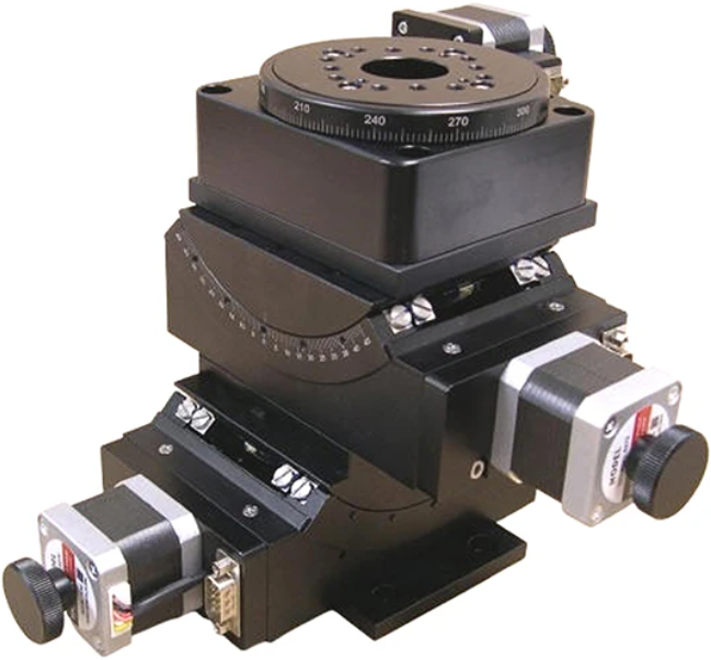 The new YPR-45-45-100 Series of Pitch, Roll, and Yaw Three-axis Stages are the integration of two +/- 45° Goniometers for lower (pitch) and middle (roll) axes, and a large upper, 100mm diameter, Rotary Stage (yaw axis). The integration of goniometers and rotary stage enables the identifying of crystals, estimating hyperspectral bidirectional reflectance, measurements of radiation patterns of LEDs, manufacturing quartz oscillator plates using quartz cutting X-rays, examining cutting edges of gloss measurements, laser machining and drilling, aligning mirrors, tracking and scanning. This series of three-axes stages feature four motor options. The -01 option (pictured) is Stepper Motor driven, the -02 option is Three-Phase Brushless Servo Motor driven with Quadrature Optical Encoders, the -03 is Brushed DC Servo Motor Driven with Quadrature Optical Encoders, and the -04 option is Stepper Motor Driven with Quadrature Optical Encoders for position verification. The Stepper Motors versions have a resolution of 0.002°, positional accuracy of 0.05°, and repeatability is +/-0.01° with a 10 Micro-steps per Step Motor Driver. The goniometer (middle and lower) axes of the -01 and -04 versions have a maximum speed of 14° per second. The positional accuracy of each axis is 0.05°, and repeatability is +/-0.01°. The -02 and -03 servo motor options with Quadrature Incremental Optical Encoders travel at speeds up to 45° per second and have greater resolution, positional accuracy, and repeatability. The rotary axis is equipped with an INDEX switch to signal the motion controller the HOME position. The goniometer axes are equipped with a positive and negative limit switches to signal the motion controller when end of travel is reached. The rotary axis has a precision pattern of threaded holes for mounting tooling or fixtures and all axes have calibrated scales for visual inspection. Each of these stages can be ordered with a fully plug-and-play compatible multi-axis motion controller for any motor combination from OES.